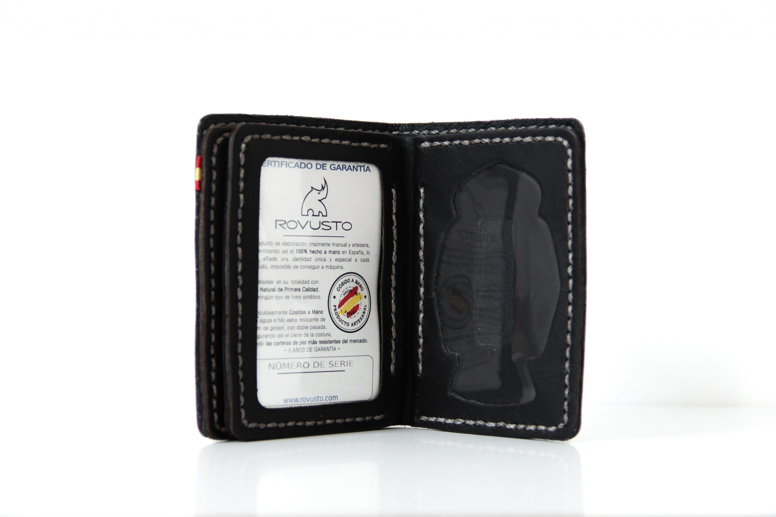 Cartera Porta placa de apertura tipo libro con billetero, 5 tarjeteros y 2 transparencias con o sin hueco para placa emblema.